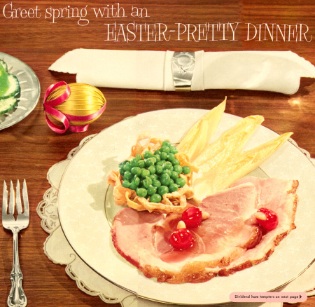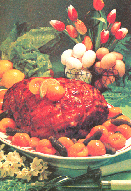 Based purely on Easter hams, I can’t figure out how anyone would say that pork is “the other white meat.” Nothing could be more colorful than a chemical-injected, color-infused canned ham from the 1960s. Add to that the rather questionable practice of coating ham with grenadine syrup, cloves, fruit cocktail, pineapple, or other sugary items, and you tend to end up with somewhat unnatural food colors. This may be why ham is so popular at Easter-it’s one way to make a dinner that matches the eggs!