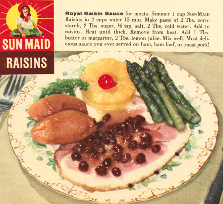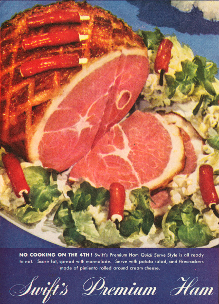 Figure 9: “Leftover” ham images. From top, apricots ‘N’ ham from a 1964 Family Circle magazine article, cranberries ‘N’ ham from a 1962 Ocean Spray ad, raisins ‘N’ ham from a 1962 Sun Maid ad, family ‘N’ ham as shown in a 1972 ad for Rath, pimento-rolled firecrackers ‘N’ ham from a 1947 Swift’s ad, and patriotism ‘N’ ham from a 1973 Hormel ad.