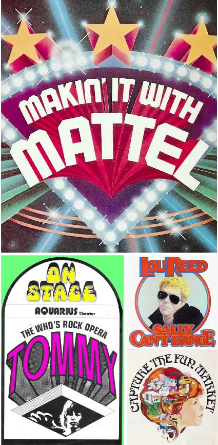 Figure 2. A mid-’70s promotion from Mattel looking very Machine-Bold-meets-Disco; a program from the stage version of the Who’s Tommy in 1972 with the words “On Stage” in a rather obscure shadow font called Mania No. 3; highly modified Souvenir on the cover of Lou Reed’s 1978 album; and a good example of a perfectly set optical circle of type (in Arnold Bocklin) for a toy company.