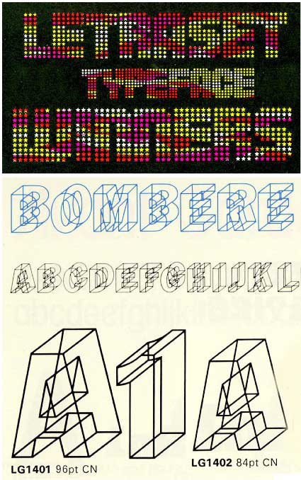 The Letraset method, dry transfer, was essentially a decal process that eliminated the water. Type characters were printed on clear transfer sheets and sold direct to the designer. Because the printing process Letraset used allowed for high detail (with no generational loss during the transfer process), the company was able to market very complicated type designs of the sort that required visual setting. Some of these may not have been technically practical for a traditional type foundry, and certainly not worth the development cost given limited market appeal. But due to relatively low production costs, Letraset could market unusual designs. Some might call them unusable, but in the ’70s not much was considered off limits.