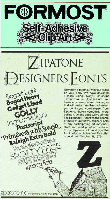 Figure 4. Clip-art company Formost used classic ’70s multiple outlines to promote its self-adhesive clip-art line in 1979. And one look at the line-up of “designer” fonts from Zipatone in 1977 gives you a good idea of what artists were buying at the time (or what someone thought they were buying). Please note the irony of naming a dry-transfer typeface “Postscript.” Hope they got a trademark on that.