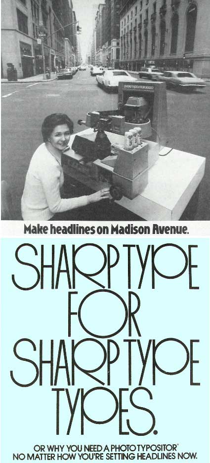 This visual method of setting the type, combined with various distortion lenses placed on the unit, gave the operator tremendous flexibility. And the low-cost filmstrips meant it was possible to stock lots of type designs, even rarely used novelty faces. The quality was quite good, too, allowing dramatic enlargement when necessary. Display type definitely grew larger in the ’60s and ’70s, in part because it could.