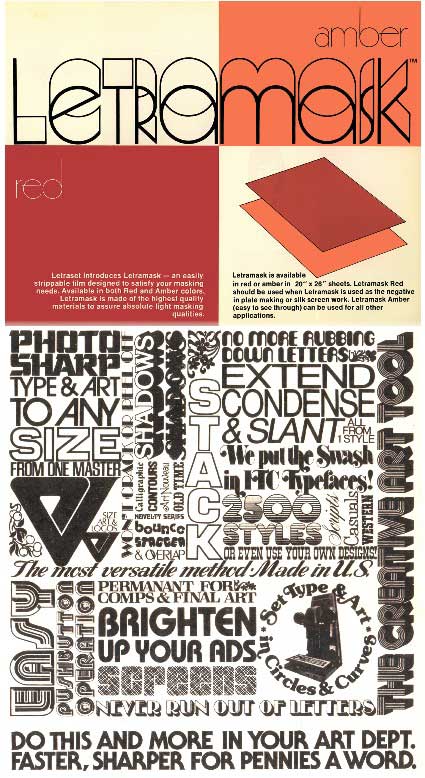 Figure 6. Anyone who worked in graphic arts during the ’70s will remember Letramask (top), though we all knew it as Rubylith and Amberlith. The rather distinctive three-dimensional typeface is Quartermane SQ, complimented by Premier Lightline. In the ad for the PhotoVision photolettering machine (bottom), designers are encouraged to set type in their own studio and promised that they will “never run out of letters.” How I wish some designers would run out of letters today.
