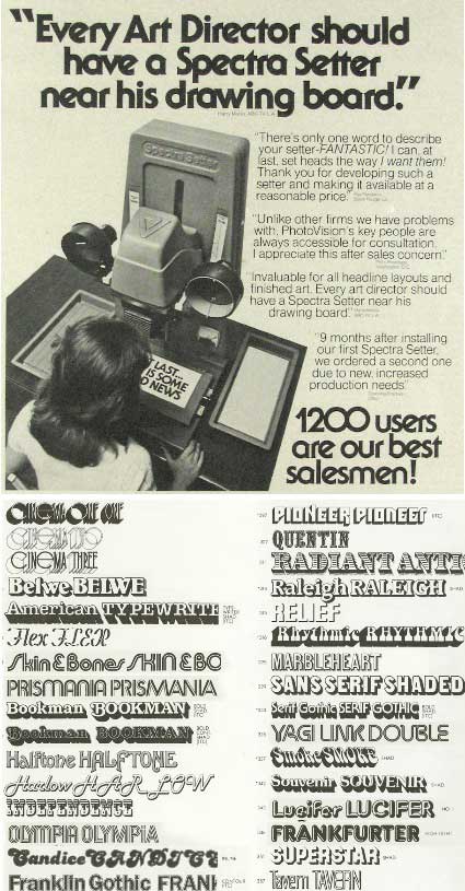 Figure 7. There were a number of competitors to the PhotoTypositor, including the Spectra Setter, shown here in a 1978 ad. Below is a sample of display faces popular in the ’70s and available from Phil’s Photo near Washington, D.C. Larger type shops like Phil’s would usually have well over 1,000 display faces and offer a number of special effects.