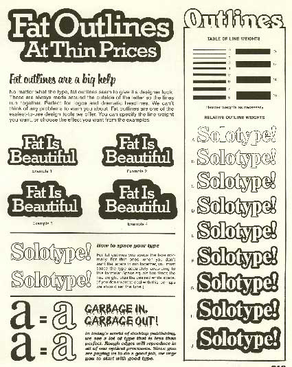 Figure 9. Solotype was a pioneer in the use of optics to distort existing type designs. Here, from a catalog of the era, are examples of the outlines the company could produce. These outlines were done on a machine that rotated two film planes in a circular motion with light projecting through the film to expose new film or paper below. By varying the rotation diameter and arc, it achieved various thicknesses and angles.