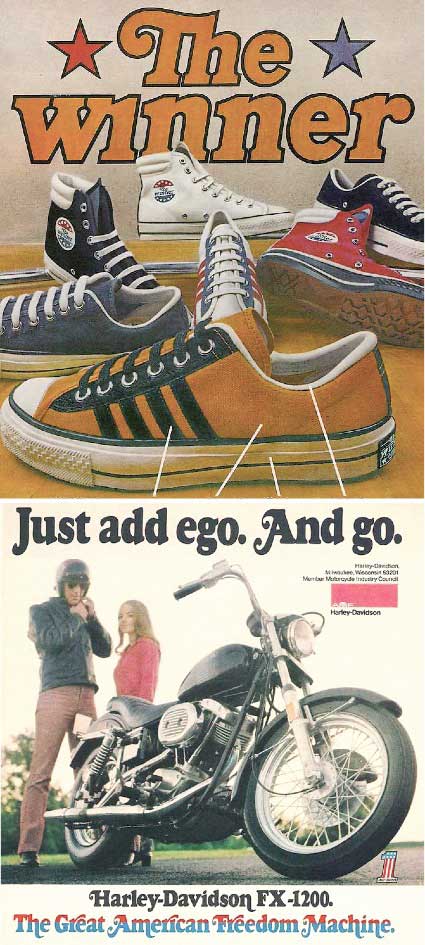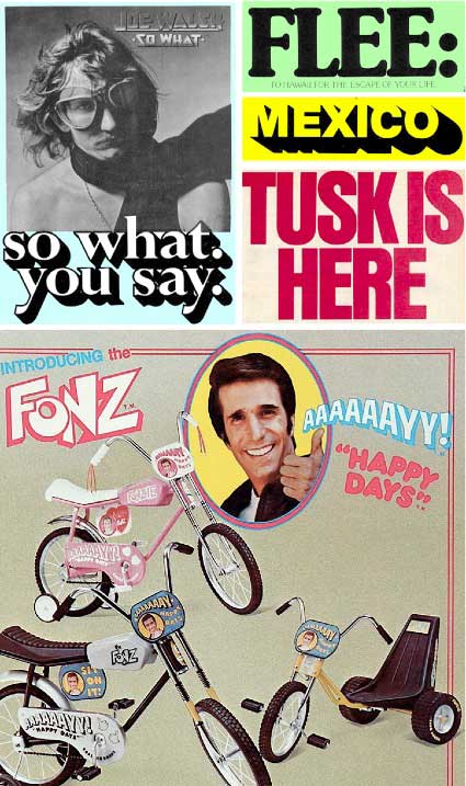 Figure 10. Before he checked in to the Hotel California with the Eagles, Joe Walsh (upper left) promoted his So What album with a very deep drop shadow. More Souvenir (upper right), this time in a 1977 ad for the Hawaiian islands; another trendy drop shadow from the Mexican Tourism Board; a hint of what was to come in the 1980s (large condensed sans serif) in a 1979 ad alerting music listeners that the much-anticipated new Fleetwood Mac album had arrived; and the Fonz promoting a line of Happy Days bicycles from Murray. In that ad is another favorite ’70s typeface, Frankfurter, designed by Bob Newman for Letraset.