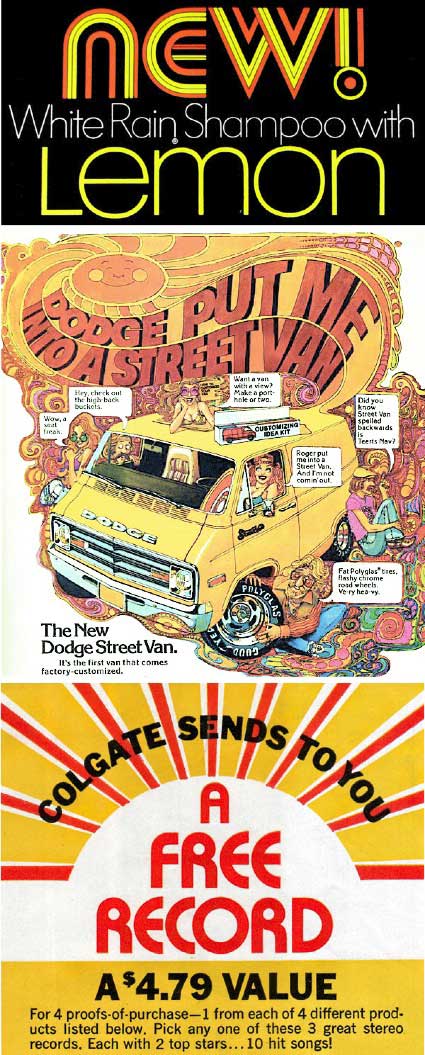 Figure 11. Let the sunshine in! These three examples give off the sort of good vibes common of the decade. Top is an ad for White Rain shampoo in 1970. Middle is a 1976 Dodge van ad, and bottom is a 1970 ad for Colgate Palmolive. The all-cap, rounded-letter Bauhaus/Busorama look was really big, but it was never a favorite of mine.
