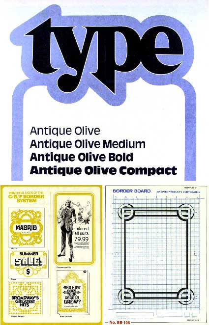Figure 12. Even though it was designed in 1963 by Roger Excoffon, Antique Olive really took off in the late ’70s. I hated it and always associated it with cheap weekly newspapers (this because I worked on a lot of cheap weekly newspapers). I think you got the entire family free when you bought any sort of typesetting machine from Compugraphic. And it wasn’t just type that took on three-dimensional qualities in the ’70s. It was also the era of pre-printed borders. C-Thru Graphics (below) sold a line of very hip ad borders, and you couldn’t beat the Boarder Board pre-printed paste-up boards from Graphic Products Corporation.