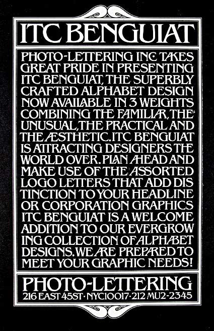 Figure 16. This 1978 ad for New York type house Photo-Lettering, Inc., was designed by Ed Benguiat to promote his new typeface design. Seeing this ad was one of the inspirations that caused me to switch from a focus on editorial to a focus on typesetting. To this day, ITC Benguiat remains one of my favorite type designs and despite being closely associated with the ’70s, I consider it timeless.
