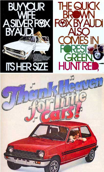 Figure 17. In 1974, well-set Avant Garde encouraged husbands to buy their wives a silver Audi Fox, for the simple reason that it was smaller than a regular Audi. But if those models weren’t small enough, you could always get a Renault Le Car (below), which was sold between 1972 and 1984. It was actually a Renault Model 5, but someone thought more people would buy it if was called Le Car. As it turned out, more people made fun of it because it was called Le Car. I suspect Le Typeface for this ad was hand-drawn.