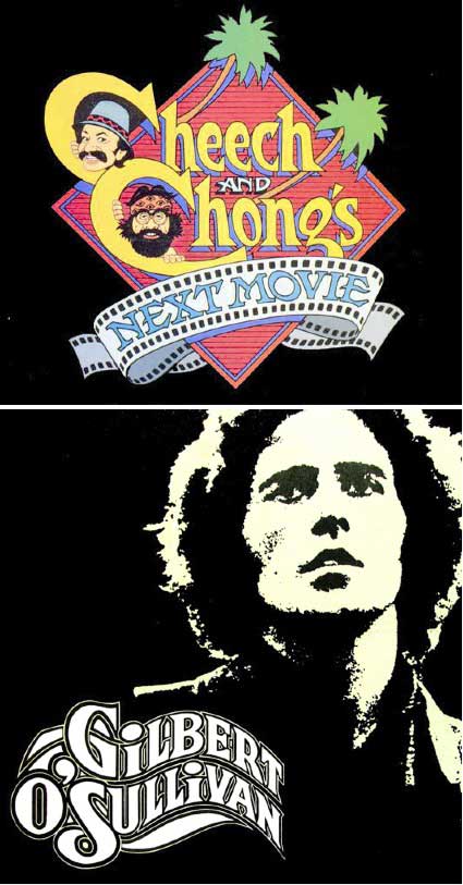 Figure 20. Plenty of ’70s logos and headlines were still hand-drawn, but they also reflected the three-dimensional, curvy look of the decade. In 1979, Cheech and Chong (top) had just finished their second movie and stopped being very funny. The ’70s also had its share of one-hit-wonders, both in type design and music. Irish musician Gilbert O’Sullivan (bottom) was a big hit when this ad ran in 1973. But by the end of the decade he was alone again, naturally.