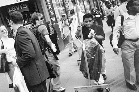 Automatic cameras may have difficulty keeping up with rapidly changing lighting situations that are common on the street. Many street shooters instead rely on their ability to manually set their cameras based on their experience. I know, for example, that if I’m walking down the street on a hazy/overcast day in New York and am shooting ISO 800 film, the exposure will be 1/500 at f/8. With experience, you learn the nuances of exposure without having to consult a light meter.