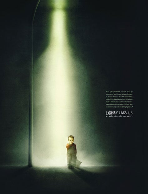 As we Finns are a nation that likes to drink, there are some shameful and serious side effects that we just don’t want to realize. You’ll read once in a while in the papers how some parents have left their sleeping kid at home while they’ve gone to get drunk at a shady saloon. Meanwhile the kid wakes up, realizes that Mom’s not home and decides to go looking outside. Kids going outdoors in pajamas and a cold Finnish winter are not a good combination. The same is true for alcohol and bad parenting. This was a pro-bono campaign that rose from the perpetual stupidity of too many parents. The whole campaign and full credits can been seen at https://adsoftheworld.com/taxonomy/brand/lasinen_lapsuus.