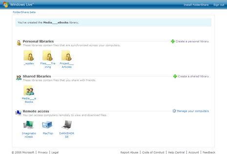 Finally, FolderShare offers a way to share your computer files with others. The Shared Libraries feature allows you to pick one or more folders to share with different people, and you can give those people different permissions — view-only, add files to the library, delete files from the library, and/or change files in the library. Unlike online file sharing services, the files you share don’t go to Microsoft’s servers; they stay on your computer, accessed by other through the secure tunnel of FolderShare.com and the FolderShare client.