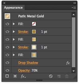 The Appearance panel is almost like a Layers panel for everything that makes up the look of a selected object. It’s the only place you can create multiple strokes and fills within an single object and then move these “object parts” up or down in the stacking order of that object. And like the Layers panel, you can hide or show any part of the stacking order by clicking a visibility eye next to its listing. You can also apply Illustrator Effects to each of the various parts of an object and use the panel to determine the order in which these Effects will be applied.