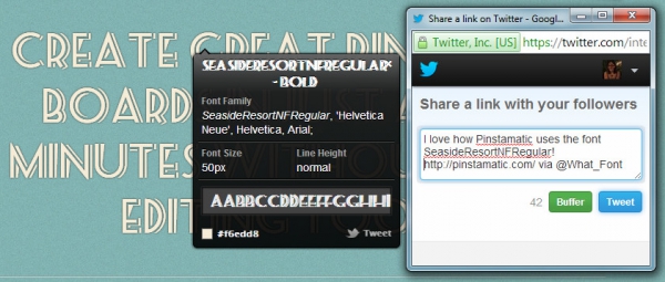 You can even tweet the discovery out to your typography-loving pals, if it’s that good, like this display font I found on Pinstamatic’s homepage.