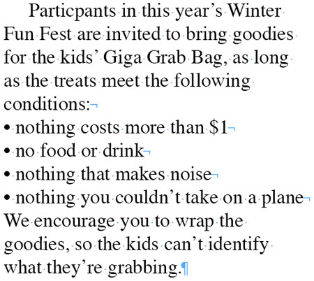 That said, you can force any line to end wherever you want by manually inserting a soft return (Shift-Return). You can use soft returns, for example, to create flush-left lists in the midst of paragraphs formatted for a first-line indent, as in the following example. (I’ve turned on “show invisibles” to reveal the non-printing aspects of the text; all text-processing and page-layout programs have some equivalent of this feature.)
