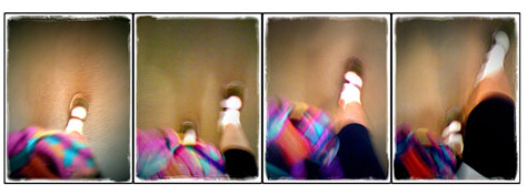 Except in the hands of the likes of David Hockney, Polaroid art was mainly individual, standalone images. Cell-phone photography again sets a similar course, and we have yet to see many significant groupings of images to tell power stories. Uncharted territory, but a potential for growth. After accidentally photographing my feet and a colorful scarf I was wearing, I was fascinated by the motion blur and implied action as well as the abstract feel. Sensing a series coming on, I racked up more than three-dozen frames and a number of strange looks from passersby.