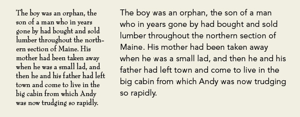 The setting on the left is more challenging to read due to the the narrow column width and the typeface’s short x-height, tight counters, and decorative characters. The setting on the right with its clean, open characters, generous type size and line spacing is much easier to read.