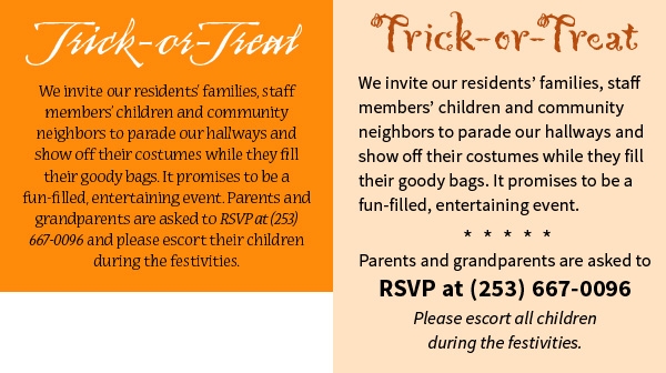 The treatment on the left sacrifices both legibility and readability in an effort to capture the spirit of the holiday– but what good is it if it is hard to read? The setting on the right is much improved (and still conveys Halloween), with its legible typefaces, generous type size and line spacing, flush-left alignment, greater color contrast, chunked up text, and emphasis on the important information.
