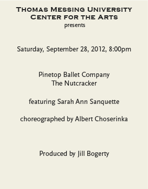 The addition of color is the final touch, creating a more lively, eye-catching composition. Color also adds emphasis to the most important elements, namely the ballet title and the dance company. The rest of the text is now dark gray, allow it to recede a bit more from the red and green type. Set in Copperplate Gothic, Scala and Scala Sans, and Home Run.