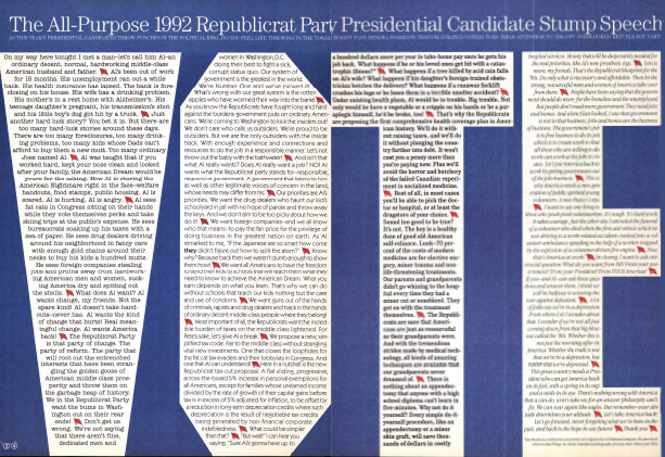A very powerful message is conveyed with type set in the shape of the word VOTE, punctuated by flags used as paragraph separators in this spread designed by The Push Pin Group. U&lc, Vol. 19, No. 3, 1993.