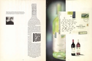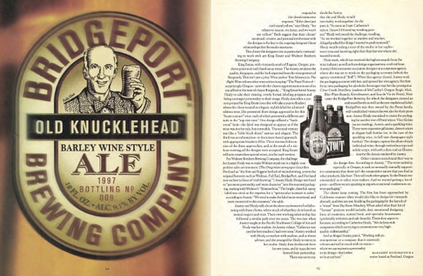 The text in these two spreads designed by Mark van Bronkhorst are shaped to mimic the contour of the items shown on the facing pages, whether it be a wine bottle or a beer bottle label. The text is justified to maintain a well-defined edge, and has been carefully composed to minimize bad spacing and too many hyphenations. U&lc, Vol. 25, No. 4, 1998.