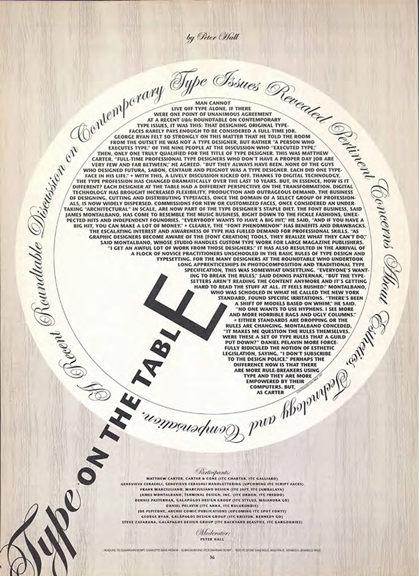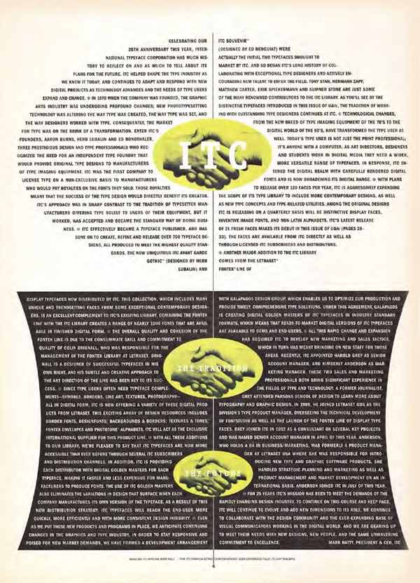 The body text for an article entitled “Type on the Table” (left) partially fills a plate as it is intruded upon by a typographic fork, cleverly integrating the headline and subhead with the text. In this article celebrating the 28th anniversary of ITC (right), the text becomes a giant initial letter as it fills the contours of an oversized – and somewhat stylized – lowercase ‘i’ (right). U&lc, Vol. 23, No. 2, 1996 and Vol. 22, No. 2, 1995, both designed by Michael Ian Kaye.