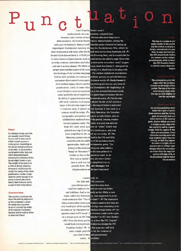 The text takes on the contour of an exclamation point in this article on Punctuation (left) while it becomes the background for the shape of a t-shirt, except for the collar and waist band which are made of type (right). Both, designed by Pentagram, are cleverly conceptualized and professionally executed. U&lc, Vol. 20, No. 4, 1994.