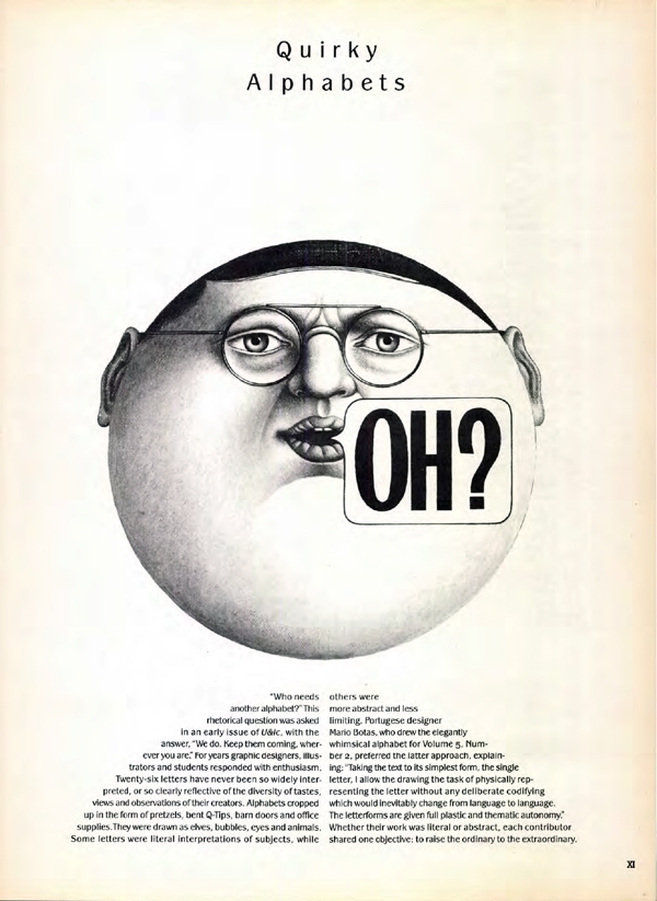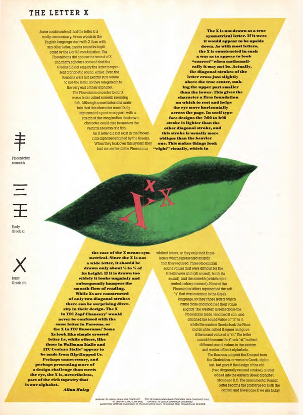 We most commonly see type—especially text type—set in perfectly aligned vertical columns that are often used as the narrative to images, whether they be photographs, illustrations, charts, or graphs. But sometimes, with a little out-of-the-box thinking, text can be used to illustrate and/or reinforce the actual content, be it the overriding theme or subject matter, or the actual images. This approach was commonly employed in U&lc due to the interesting and entertaining nature of the content, coupled with the complete freedom offered the designers who worked on this one-of-a-kind publication.