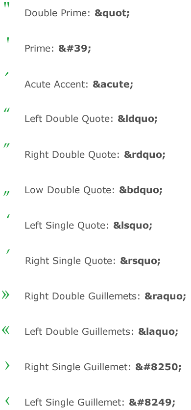 Left and right double quotes. Quotation marks look similar to apostrophes. The left quotes opening the quotation above look like two little sixes (66), while the right quotes closing the quotation look like two little nines (99).