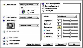 Figure 2: Here’s Epson’s printer dialog box in Mac OS 9.2. The ink-saving Economy mode only works for plain paper and lower resolutions. It also let me boost the saturation of colors in the output with the advanced settings option.