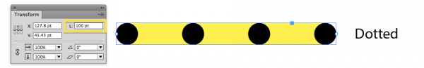 To actually get a Custom Dotted line to look the same length as one of the built in dotted stroke styles (Dotted or Japanese Dots), you’ll need to subtract the thickness of the stroke from the length of the line. In this case, my strokes should be 100 points long. So to get my 10 point thick Custom Dotted stroke to visually appear 100 points long, I need to set the length to 90 points.