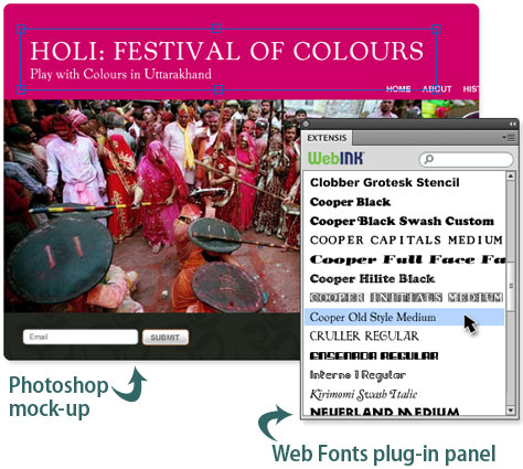Extensis recognized this dilemma and came up with a solution: the Web Font plug-in for Photoshop. Now in public beta, this free plug-in gives you access to many of Extensis’ WebINK webfonts. You don’t have to pay until you’ve made final webfont choices and are ready to take your website live.