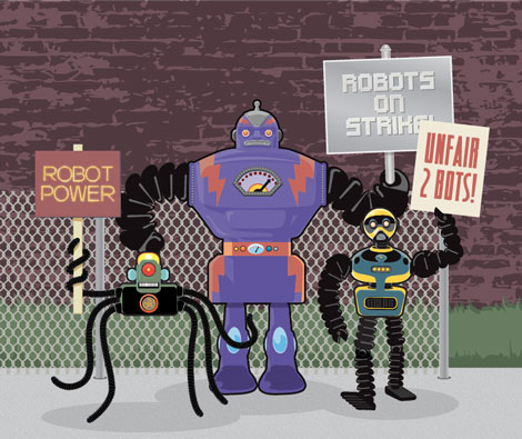 Larrett then modified the art by varying the pattern brush line weight and stroke profiles. To adjust the width of a selected robot arm, he changed the line weight in the Control panel or Stroke panel by clicking in the numeric field and using the up arrow and down arrow keys to increase or decrease stroke weight as desired (adding the Shift key alters the weight by increments of 10). To manually adjust only selected portions of the robot limb, Larrett used the Width tool (Shift-W). Placing the tool over a point on a path, he moved the diamond-shaped handles to widen or narrow a portion of the path. Lastly, he combined some old and newly-made swatches to create additional brushes for other robots’ limbs.