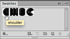 To create the shoulder piece, he first modified a shape made with the Ellipse tool. Using the Pen tool, he drew a lighter, unfilled path with a Round Cap for the highlight to complete the shoulder. He then dragged the shoulder art into the Swatches panel, naming it “shoulder” so he would recognize it as he built the pattern brush. In the same way he created the arm link, hand, and elbow swatches for the pattern brush tiles. He made sure that the various pieces were facing in the correct direction relative to the pattern tiles, which run at right angles to the path, before individually dragging each one into the Swatches panel (alternatively, you can select art and click the New Swatch icon, or choose Object > Pattern > Make).