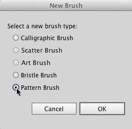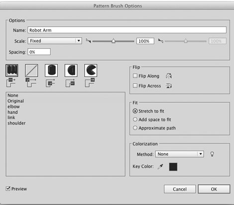 To build the pattern brush for the robot arm, Larrett opened the Brushes panel, clicked New Brush in the Pattern Brush Options dialog, and then clicked OK. He enabled the first box in the panel (the Side Tile), and when prompted selected the pattern swatch for the arm link. Next he placed the other tiles in the appropriate position: the shoulder to the Start Tile box, the hand in the End Tile box, and the elbow in the Inner Corner Tile box. He named the new pattern brush Robot Arm, and clicked OK.