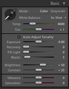 In the Basic pane, you’ll also find Brightness and Contrast sliders. These work like the Brightness and Contrast sliders in Camera Raw, not like the Brightness/Contrast adjustment in Photoshop. Brightness makes a mid-point, or gamma adjustment, to your image (just like moving the midpoint slider in the Levels dialog), while Contrast adjusts the white and black points simultaneously to increase contrast in your scene. By default, the Brightness slider has a value of +50.