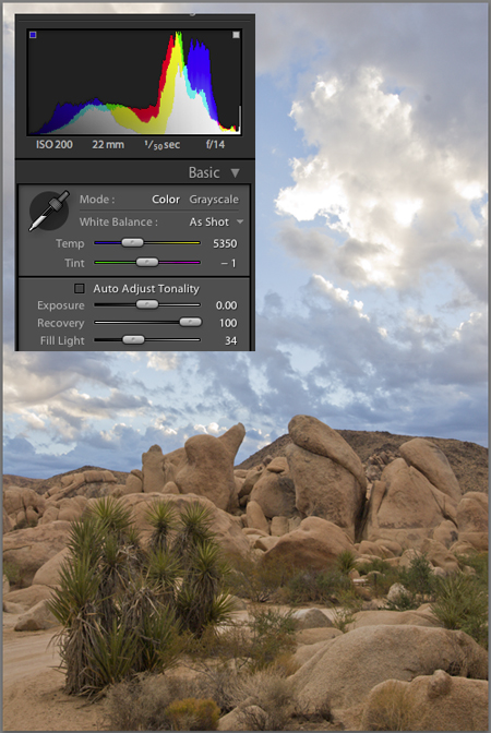 After Recovery, the foreground of this image was still too dark. I could have used the Exposure slider to brighten the scene, but that would undo the highlight recovery. Instead, I used the Fill Light slider to brighten the shadowy areas of the scene (Figure 5).