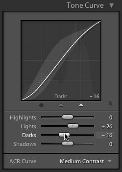 The Tone Curve in the Lightroom editing pane lets you work as you would in Photoshop’s Curves dialog: You can click and drag points to reshape the curve. But Lightroom’s Curves tool also includes sliders with which you can easily reshape specific parts of the curve. Using the Highlights, Lights, Darks, and Shadows sliders, you can raise or lower specific parts of the curve as if you were clicking and dragging a point.