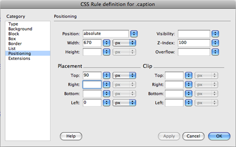 2. Double-click .caption in the CSS styles panel to open the CSS Rule Definition window and edit the style. Click the positioning category in the left-hand list. Choose absolute from the position menu, and in the Placement boxes type 90 in the Top box and 0 in the Left box. Finally, type 100 in the Z-Index box (Figure 4). Click OK to complete the style.