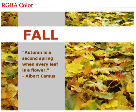 7. Locate the .caption style and change color: #B53810; to color: rgba(181,56,16,.6); . This makes the word “FALL” in the first paragraph 50% transparent. Save the page and preview it in a browser. It should look like Figure 6 in all browsers except Internet Explorer. You’ll fix the page for that browser next.