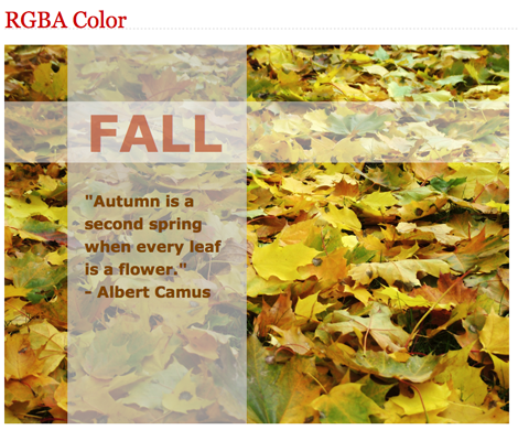 This style adds the transparent background color for the paragraph with the word “FALL” in it — 50% transparent (7F) and white (FFFFFF). In addition, since you used an rgba value earlier to make the text color transparent, you need to supply a color here (color: #B53810;) so that IE uses the proper color for the text. Unfortunately, you can’t use this filter property to create a transparent color for text. It only works for background colors. However, there is a way around this problem. You can use another filter to set the opacity of the text.