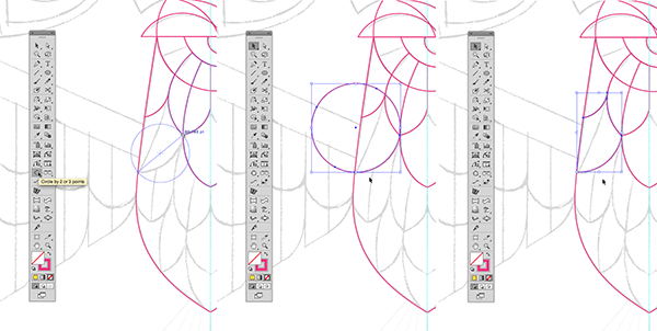 Von used a tool from the SubScribe plugin to quickly shape a feather using a circle oriented to fit the drawing, then removed the excess using Illustrator’s Pathfinder functions.