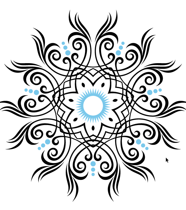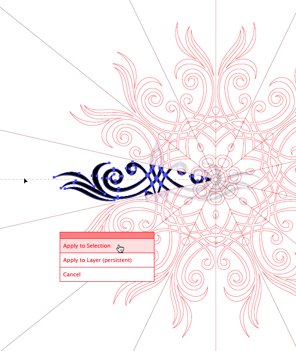 Von chose Apply to Selection from the popup annotation, which left him in MirrorMe mode for further exploration. He could still hover his cursor over the art to make yet another design or change the number of axes for the reflection. Once he selected a different tool, however, the art became a normal vector object that could be edited using any combination of Illustrator’s tools and other Astute Graphics plugins, such as VectorScribe or Dynamic Corners.