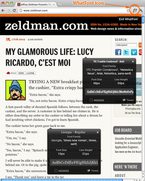 Installing WhatFont is as easy as dragging a bookmarklet to your Web browser’s bookmark bar. Then whenever you’re curious about a font on a webpage, you click the name or icon in the bar and hover over the text. WhatFont will reveal the typeface’s name, size, and color; its font family; what back-up font choices the web designers specified; and show you alphabetical upper-and lowercase examples of the font. If the font you’ve found is a Google font or from Typekit, WhatFont will also identify the relevant webfont service. There’s even a Twitter button you can click if you want to tweet your discovery.
