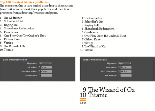 Figure 10: The appearance of a numbered list with with both one- and two-digit numbers can be improved by right-aligning the numbers and subtracting the width of the numbers from the Fist Line Indent value.