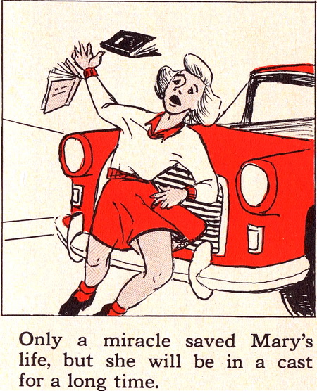 My mother was a school nurse and, like this booklet, took a grim view of horseplay and thoughtless behavior. From earlier than I can remember, we were told of the dangers inherent in everyday life, and how to avoid them. “You certainly don’t want to be crippled for life,” was a fairly common statement around the house, and that was the presumed outcome for children who ignored safety rules.