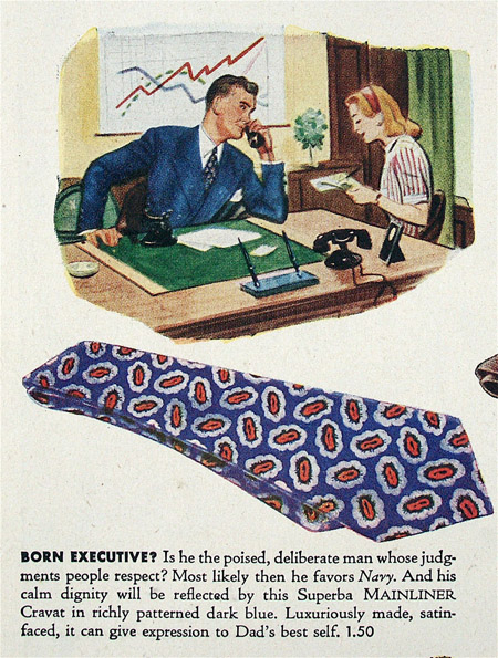 In America, though, tie fashion mostly comes and goes along with other trends. The tie has always been a place for men to express their individuality, and as you can see from ads like these from the 1940s, it’s been an opportunity to be a little flamboyant.