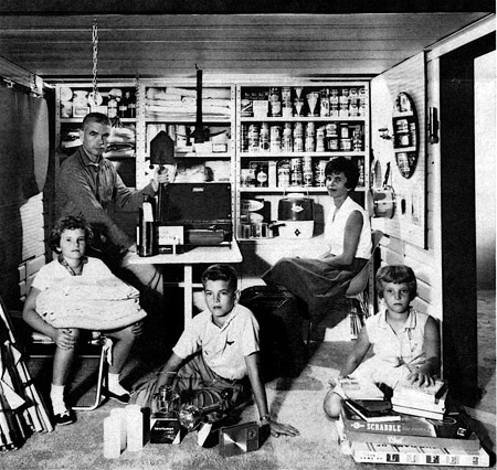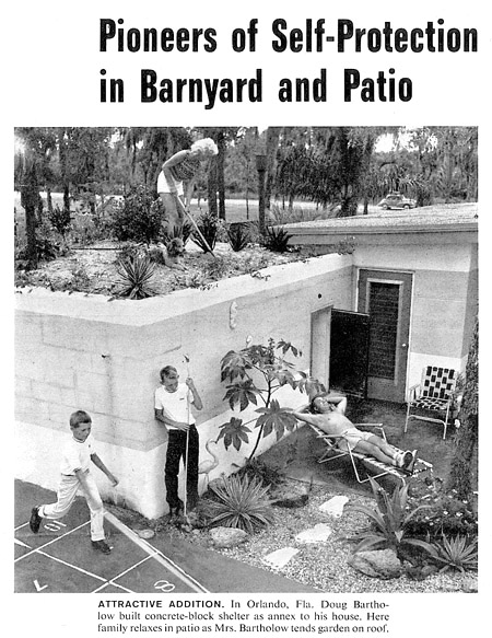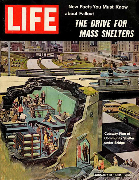 And while I don’t think many people built fallout shelters, many people thought about it, and a small industry was born almost overnight. At my house we started digging a big hole in the backyard but only got about five feet deep before giving up. Here, in 1962, a Life Magazine cover talks about public shelters, and goes on to show examples of how some families were dealing with their own shelter efforts.